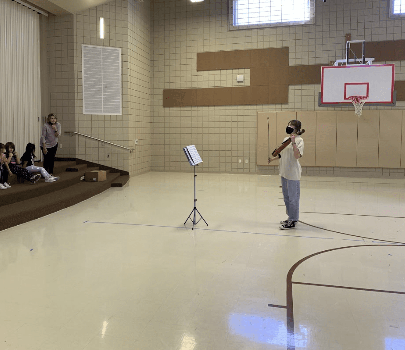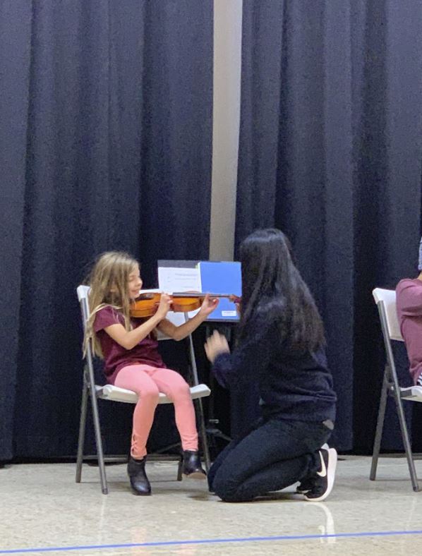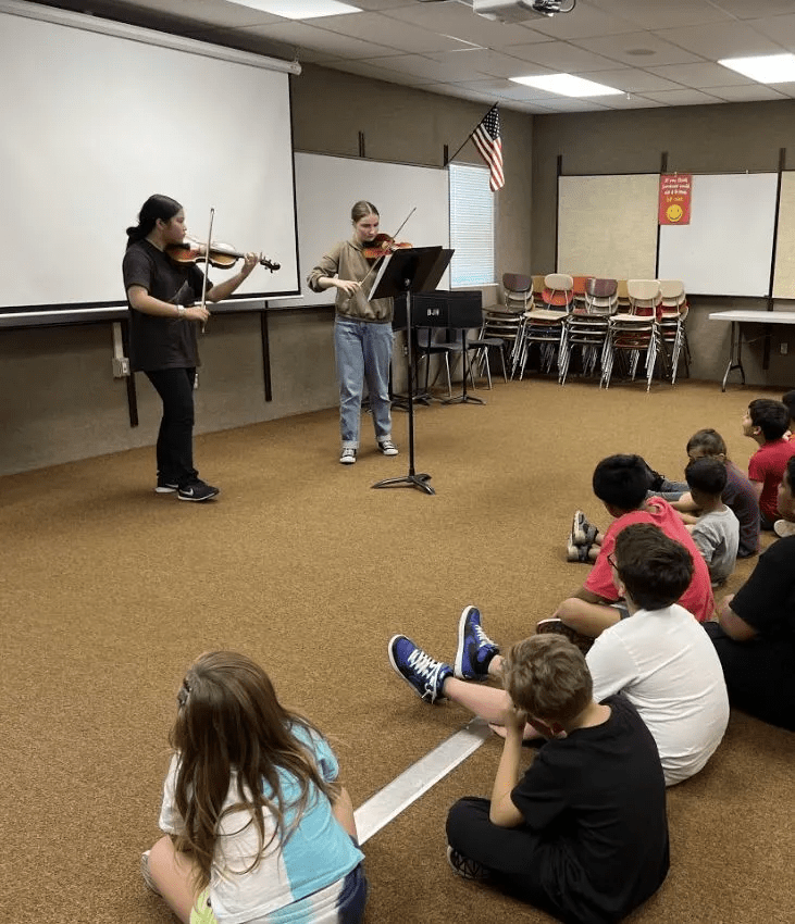 Alice Leppert (Vice President) and Maia Nix performed violin duets for a total of 50 students in 3 groups, with the help of Eddie Li and Keira McNamara. Thanks to Ms. Trish Wade, the orchestra teacher, for having us!